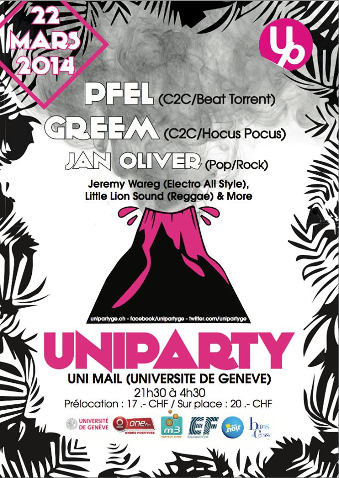 C’est au cours de l’Assemblée Générale de cette association, dont la date sera annoncée ultérieurement, que les projets financés seront annoncés. En posant cette action, l’association UniParty parvient d’une certaine manière à démontrer que fête n’est pas seulement synonyme de débauche ; les recettes de la soirée seront principalement d’utilité publique et permettront à des idées folles de devenir les plus belles réalités. Les dossiers doivent être envoyés à l’adresse tresorerie-up@unige.ch avant le 9 mai 2014 à 17h. Bonne chance à toutes et à tous !