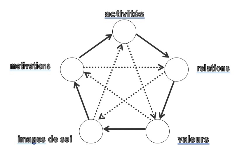 Ces cinq éléments sont des dimensions de l’expérience à travers lesquelles nous lisons la réalité (intériorisation) et à travers lesquelles nous agissons (extériorisation). Elles sont à la fois structurées et structurantes. C’est l’individu réflexif qui donne à cette structure une plus ou moins grande prégnance critique sous forme d’interprétations et de réagencements continuels de ses perceptions et de ses actions.