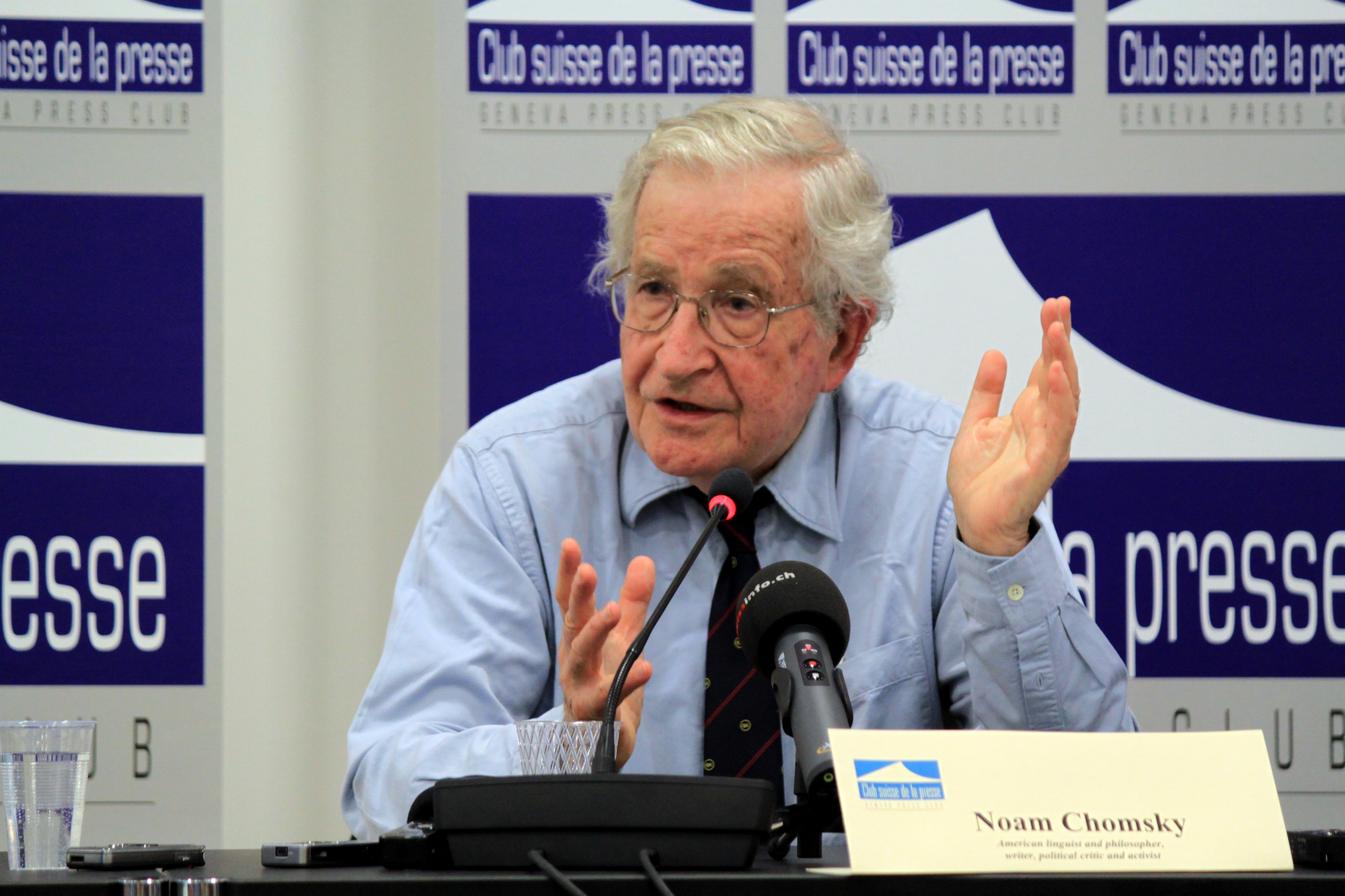 Vendredi 26 juillet 2013, salle comble au Club suisse de la presse à Genève. Les journalistes helvétiques et internationaux se sont déplacés en masse pour accueillir celui dont nul ne peut contester le statut de figure intellectuelle majeure de notre époque. Illustre linguiste et professeur émérite au MIT, Noam Chomsky est aussi connu pour son parcours intellectuel engagé. Ce fervent défenseur de la liberté d’expression, à la fois idolâtré et haï, a toujours été mu par une volonté farouche de s’affranchir de la pensée dominante. C’est précisément cet esprit émancipateur qui l’a poussé à prendre fermement position dans le débat public, depuis les années soixante, en s’insurgeant avec constance contre la propagande médiatique et l’impérialisme sous toutes ses formes. À l’image de son œuvre bicéphale, après avoir endossé la casquette du linguiste la veille à l’Université de Genève, Chomsky s’est adressé vendredi passé au parterre de journalistes en sa qualité d’analyste des affaires internationales.