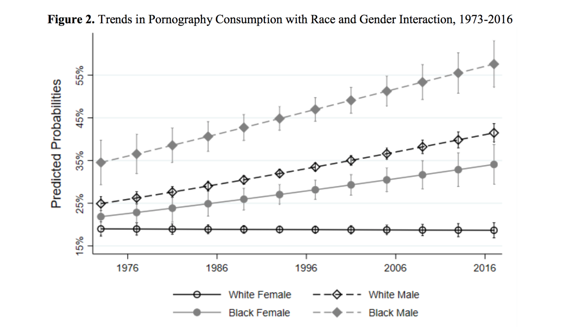 Graphique tiré de Perry, S. L., & Schleifer, C. (2017). Race and trends in pornography viewership, 1973–2016: Examining the moderating roles of gender and religion. The Journal of Sex Research, 1-12