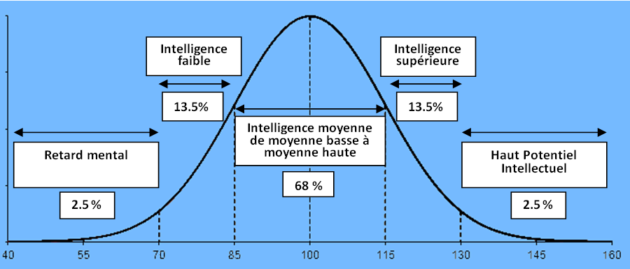 Courbe de Gauss de la répartition de l’intelligence – échelle de Weschler | https://comprendrelautisme.com/les-tests/la-wais-4/