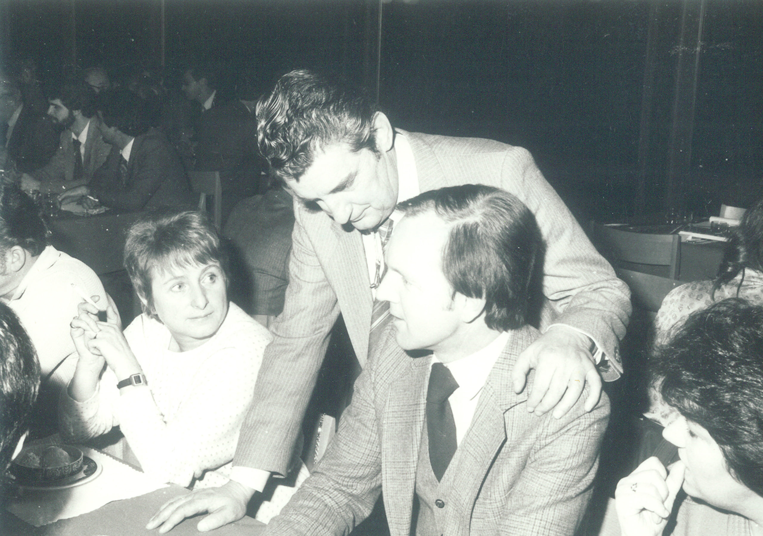 Charly Corbat s’entretient avec Claude Riat, cadre à la Banque cantonale du Jura, lors d’une soirée organisée le 25 mars 1982 chez Burrus, à Boncourt, après l’ascension du HCA en LNB (Archives privée de la famille Corbat).