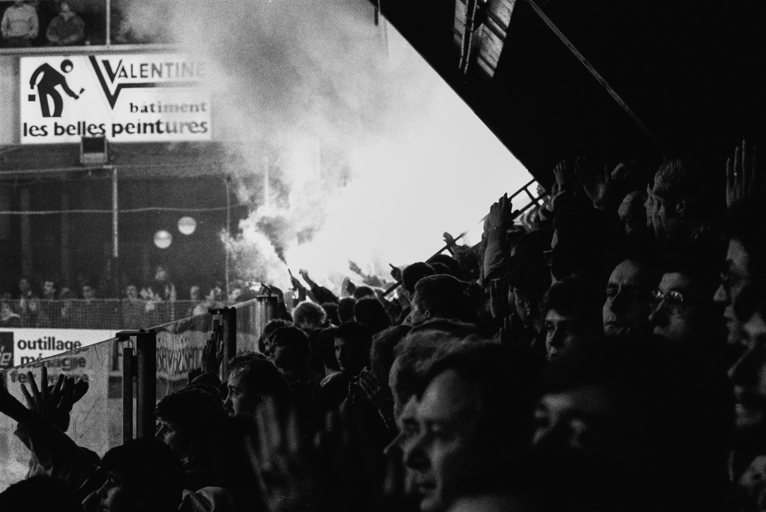 Les supporters zurichois dans un nuage de fumigènes lors du match d’ascension en LNA à la patinoire du Voyeboeuf (1988) (© Jean-Claude Vuille)