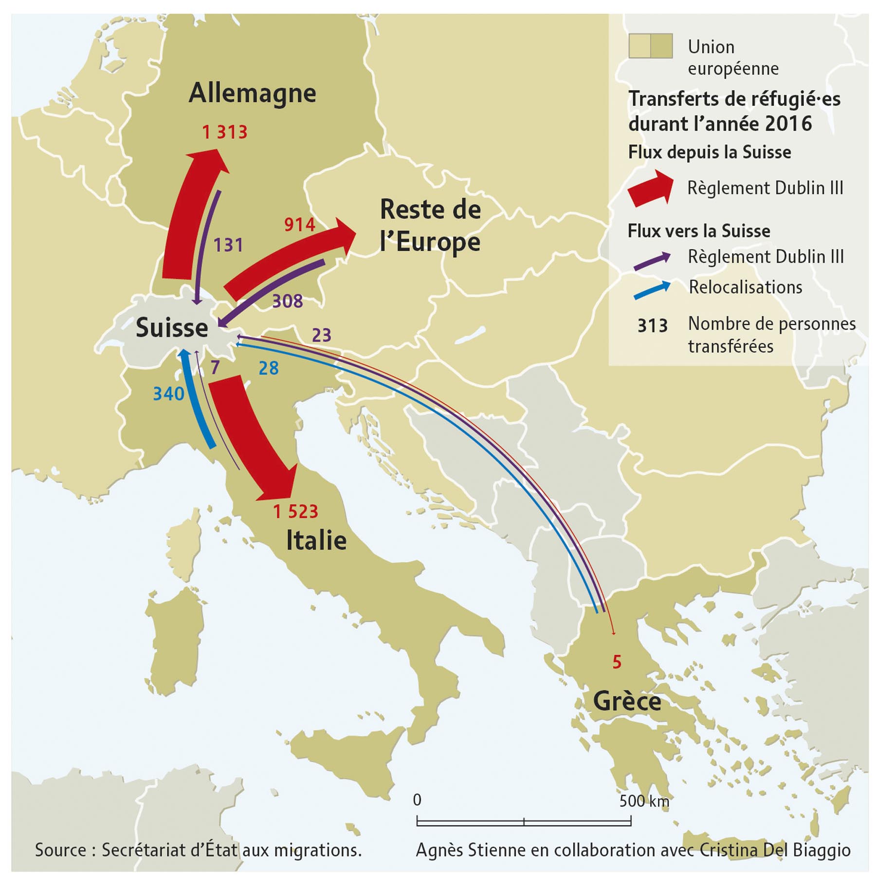 Carte des transferts Dublin effectués depuis la Suisse et vers la Suisse en 2016 et des relocalisations depuis la Grèce et l’Italie, Agnès Stienne, collaboration Cristina Del Biaggio, Vivre Ensemble, 2017. Voir aussi l’analyse: “Transferts Dublin et relocalisation | Le mythe de la Suisse solidaire“.