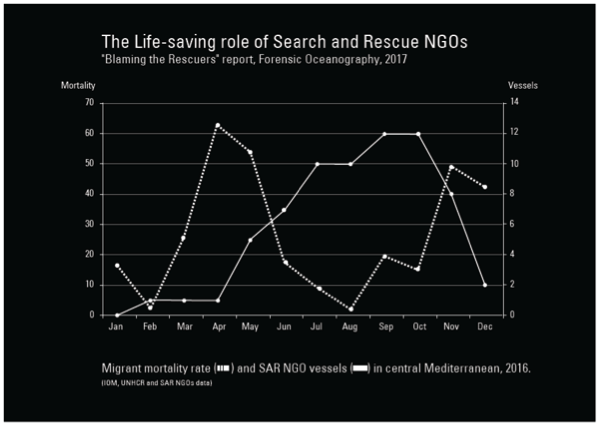 Le rôle de «sauveurs de vie» des ONG actives en Méditerranée, in Charles Heller et Lorenzo Pezzani, Blaming the Rescuers, 2017. In: Blaming the Rescuers