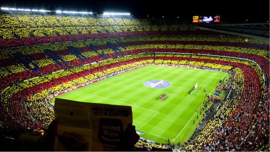 7 octobre 2012 : la gigantesque Senyera déployée par les 98’000 « Culés » du Camp Nou lors du Clásico.