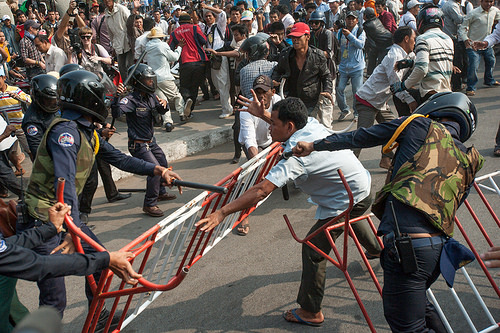 A la suite de cette interview, l’optimisme de Monsieur Hoeun s’est vu contrarié par la violente répression des ouvriers du textile lors de manifestations tenues début 2014 dans la capitale. La police a tué 6 manifestants, en a blessé des dizaines, de nombreuses arrestations ont eu lieu, ponctuées pour certaines d’intenses passages à tabacxii, et le droit de manifester a depuis été suspendu à Phnom Penh (« un état d’urgence qui ne dit pas son nom », selon Sam Rainsyxiii). Cette nouvelle entrave au développement démocratique du Cambodge fait écho aux prévisions les plus sombres quant à l’avenir du pays ; certains observateurs anticipent la mise en place d’une dynastie au pouvoirxiv et Hun Sen lui-même se déclare prêt à rester au pouvoir jusqu’à 90 ans (soit encore une trentaine d’années) tout en brandissant la menace d’une nouvelle guerre civile et d’une guerre contre le Vietnam en cas de destitution de son partixv.