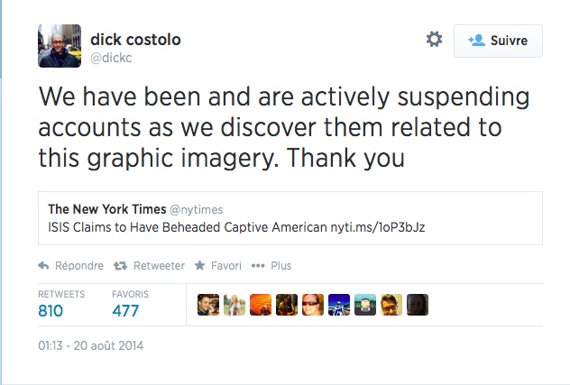 Deux considérations peuvent être discutées au sujet de la publication des images de la mort de James Foley. Tout d’abord, on s’aperçoit que les réseaux sociaux peinent à gérer les contenus qu’ils proposent. En effet, des entreprises comme YouTube ou Twitter dépendent directement de leurs utilisateurs, qui dénoncent les contenus offensants ou violant le règlement de la communauté, car elles ne contrôlent pas de manière proactive tous les posts, tweets, vidéos et images publiés sur leur plateforme (le pourraient-elles seulement au vu de la quantité de contenus publiés quotidiennement ?). De plus, il est parfois difficile de déterminer si tel ou tel contenu est violent ou insultant, ou s’il incarne un simple acte de parole rendu public au nom de la liberté d’expression4. Une intrication de problématiques qui a de quoi rendre pessimiste plus d’un journaliste vigilant quotidiennement ces réseaux sociaux, à l’instar de Shane Harris de Foreign Policy. Selon lui, les réseaux sociaux se battent dans ce type de cas pour un combat perdu d’avance.