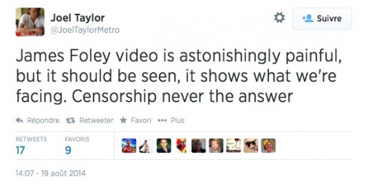 Pour en revenir à la publication de la vidéo de l’EI ou d’images s’y référant, on constate une grande majorité de médias faisant le choix de ne rien montrer… ou presque. C’est notamment le cas de France 24 ou du déjà mentionné Washington Post. D’autres, à l’instar de Rue 89 ou du Temps, précisent explicitement qu’ils ne diffuseront pas la vidéo de la mort de James Foley, mais publient tout de même des captures d’écran de la séquence sur leur site internet respectif14.
