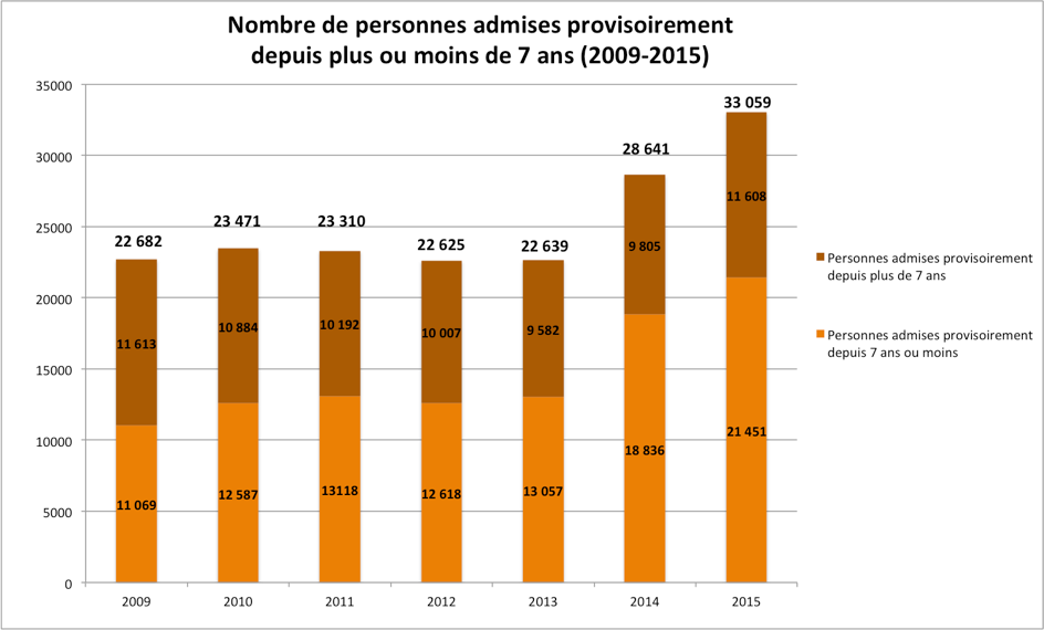 Un autre exemple est constitué par la catégorie des personnes « admises provisoirement » en Suisse, lesquelles obtiennent un permis F. Tout d’abord, il y a un problème avec l’emploi de l’adjectif « provisoire ». Les chiffres montrent en effet le peu de pertinence de ce mot : en 2015, il n’y avait pas moins de 21’451 personnes étiquetées « provisoires » depuis 7 ans ou moins, et 11’608 qui l’étaient depuis plus de 7 ans !