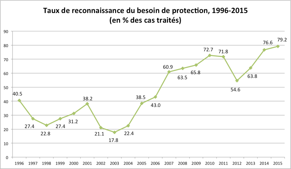 Dès lors, les inclure dans les « rejets » ne reflète non seulement pas la réalité, mais alimente par ailleurs le discours bien à la mode des « faux réfugiés » qui, clairement, ne représentent qu’un minime pourcentage des demandeurs d’asile. En réalité, comme nous l’avons vu, les chiffres de 2015 montrent que lorsque la Suisse a examiné les motifs d’asile, elle a reconnu un besoin de protection (statut de réfugié ou admission provisoire) dans 79,2% des cas. Pour les trois premières nationalités de provenance – dans l’ordre Érythrée, Afghanistan et Syrie – ce taux atteint 95,6% pour les ressortissants érythréens, 92,2% pour les Afghans et 97,5% pour les Syriens.