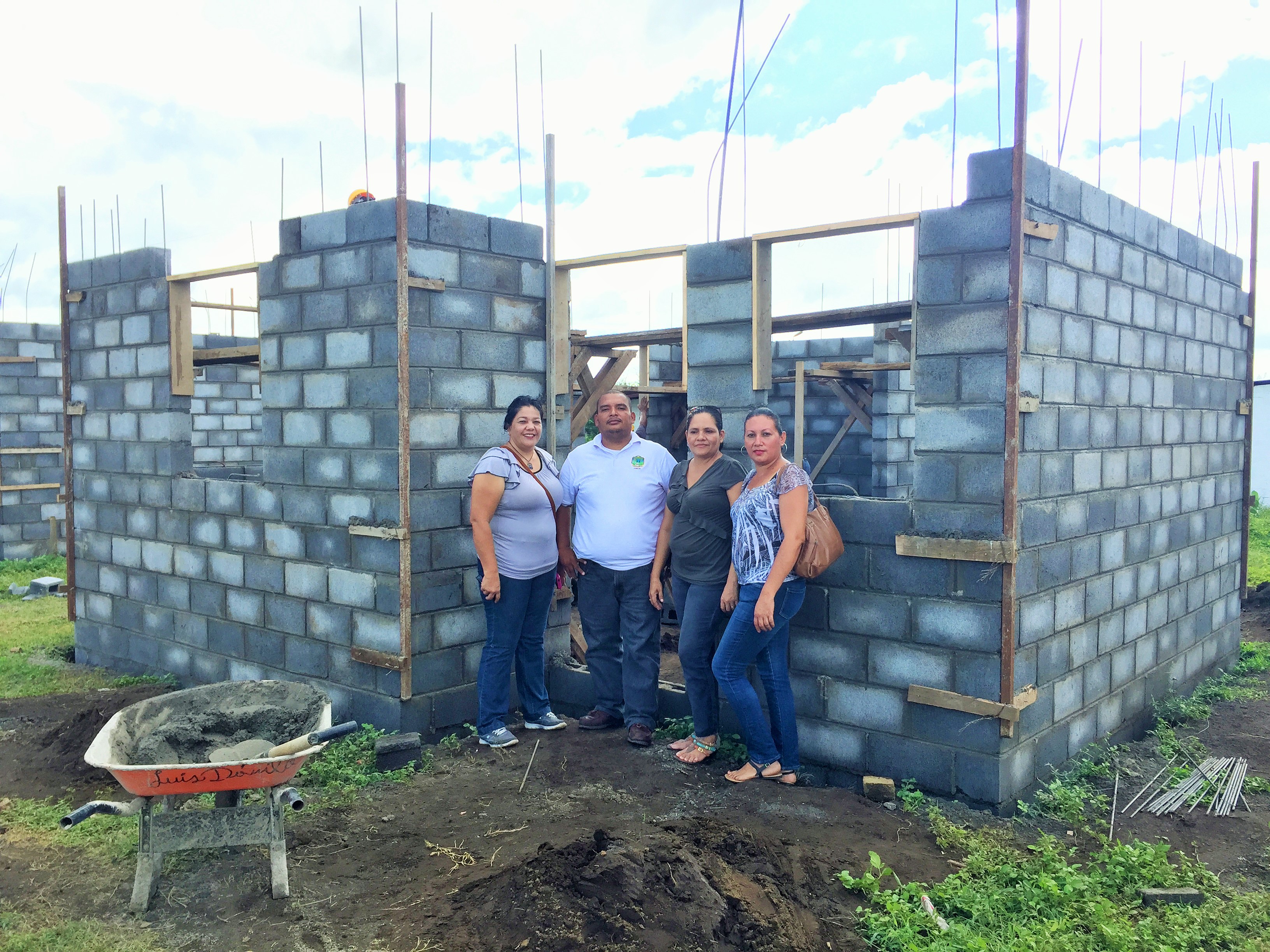 De gauche à droite: Faniz Jirón, responsable de CENCOVICOD, Benito, Adela et Emma, coopérativistes de Manos Amigos, devant la maison en cours de construction de Benito. [M. Lutz]
