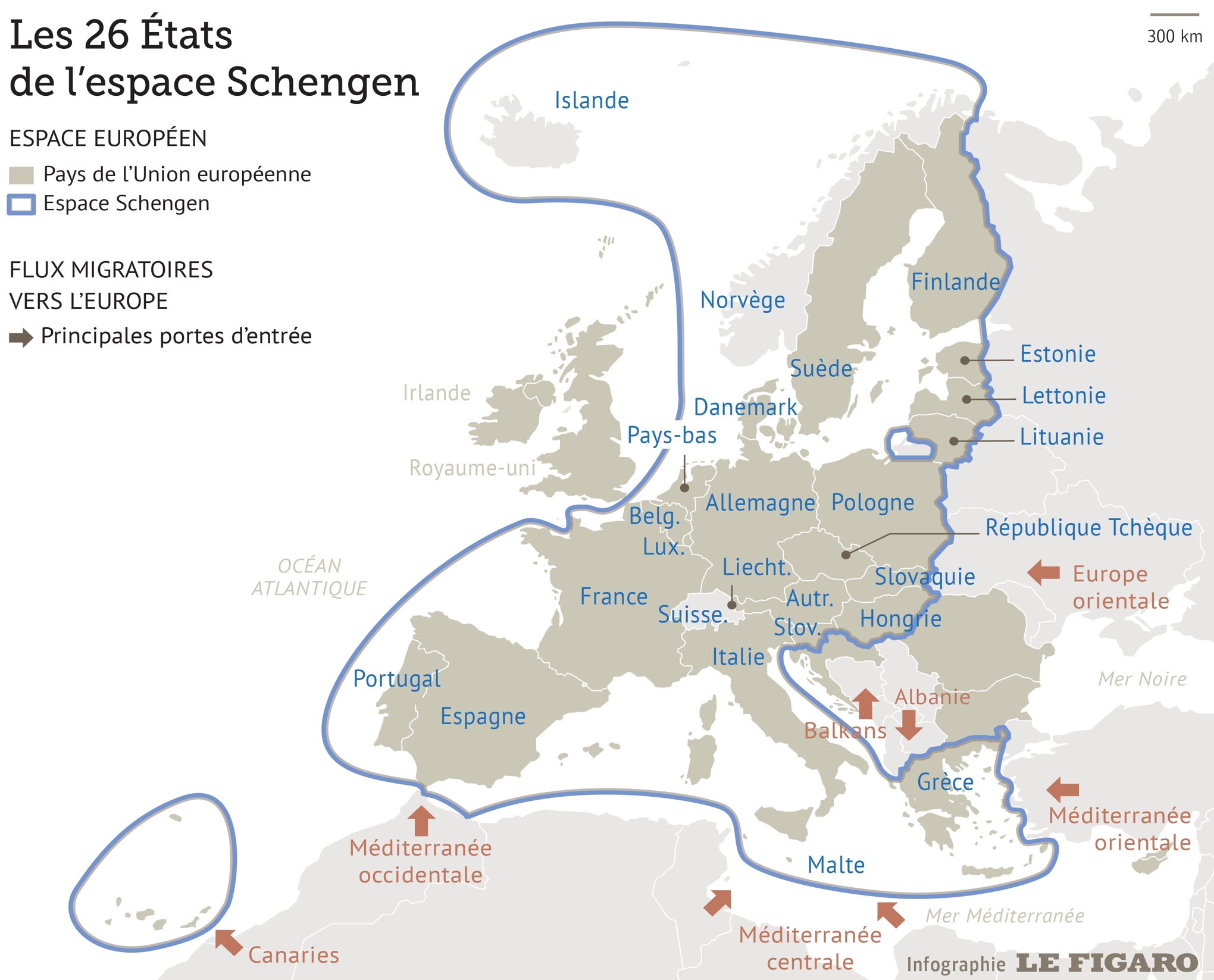 4. Au milieu des années quatre-vingt, les États du Benelux, l’Allemagne de l’Ouest et la France décident de réduire progressivement les contrôles à leurs frontières avec l’objectif de long terme de les abolir complètement. Cette volonté politique se traduit par le biais d’un accord intergouvernemental signé dans la petite ville luxembourgeoise de Schengen en 1985. La mise en œuvre de cet accord ne sera toutefois pas effective avant la signature en 1990 de la Convention d’application, entrée en vigueur seulement cinq ans plus tard. L’acquis de Schengen est intégré dans le cadre communautaire européen en 1999 avec le Traité d’Amsterdam. À la faveur d’un élargissement graduel, l’espace Schengen couvre aujourd’hui 26 États et épouse largement les contours de l’Union européenne, bien que non point parfaitement. Voir carte ci-dessus.