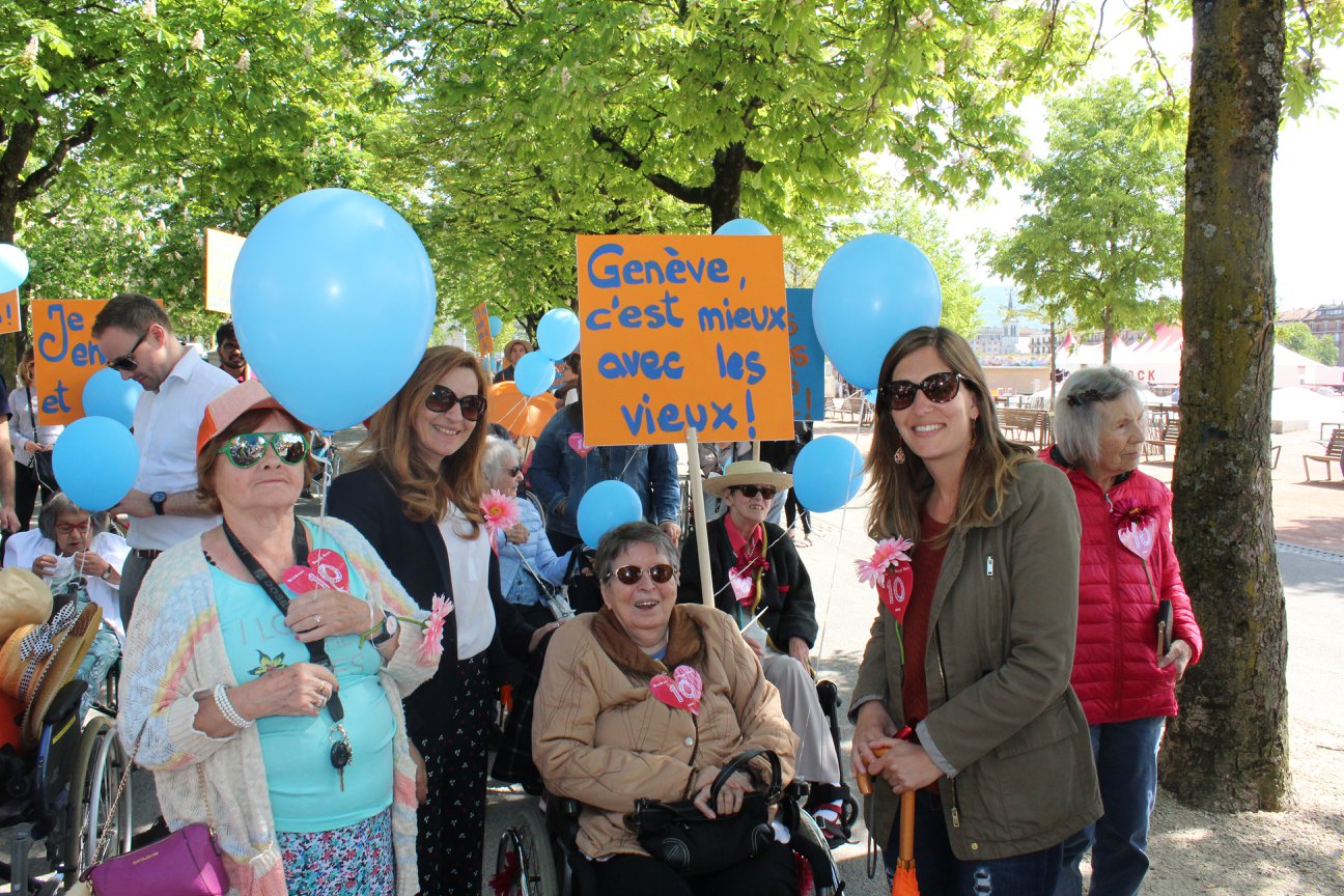 Photo prise à l’occasion de la slowmob des résidents, manifestation qui s’est déroulée, au centre-ville de Genève le 26 avril 2018 à l’occasion des 20 ans de la Fédération genevoise des EMS. [Fegems]