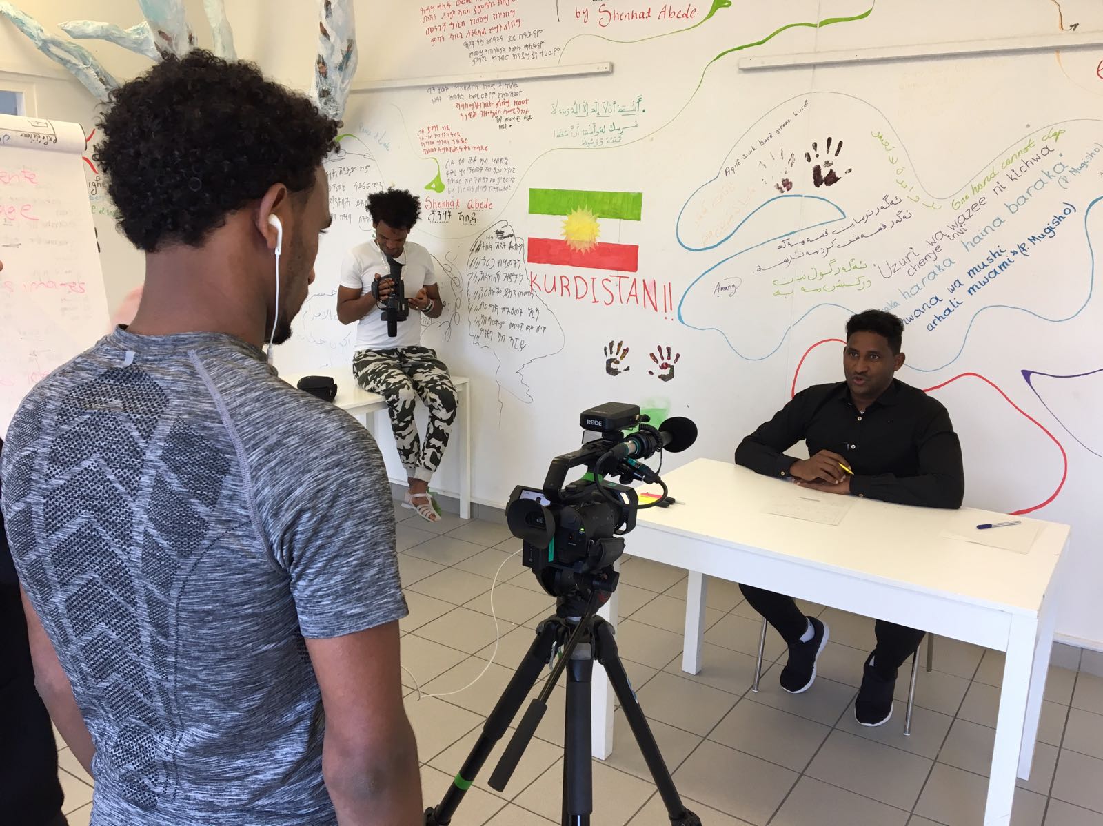 Pour mener à bien le projet, nous nous sommes associés à l’Hospice général de Genève, qui nous a ouvert les portes de ses centres d’hébergement, à Point Prod/Actua, qui nous a soutenus dans la phase de post-production des courts-métrages, et au Festival du film et forum international sur les droits humains (FIFDH), qui nous permet de projeter les films durant la programmation officielle. Nous avons également fait appel au savoir-faire et aux compétences de jeunes professionnels – Thomas Epitaux-Fallot, un journaliste, Laurence Rasti, une photographe, Chloé Simonin et Margot Lançons, deux artistes visuels, ainsi que Maëlle Gross, une plasticienne.