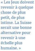 Oui je le suis. Sotchi a atteint le maximum du gigantisme. Cinquante milliards, une zone totalement défrichée puis reconstruite, des méfaits terribles pour l’environnement et plein d’autres folies. Tout ça pour servir la volonté de puissance d’un seul homme… Ce n’est pas comme ça que je conçois l’esprit olympique. Les Jeux doivent revenir à quelque chose de plus petit, de plus intime. La Suisse serait une bonne alternative pour retourner à une échelle plus humaine. Mais pour cela, il faudrait poser la candidature du pays tout entier et non d’une seule région. On pourrait par exemple présenter la candidature « Switzerland » et proposer quelque chose de sympa.