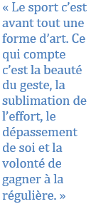Qui gagne ou qui perd m’intéresse assez peu. J’aime avant tout la beauté et l’intensité du spectacle. Je suis à moitié italien, mais si l’Italie perd en finale de la Coupe du monde, ma déception ne dure qu’un quart d’heure. Après je passe à autre chose. Ce qui compte c’est que la finale ait été palpitante, belle, forte, sexy même ! Je suis à un stade de ma vie où j’ai trop vu l’hystérie, le nationalisme et la connerie de certains ultras pour véritablement me sentir proche d’une équipe. Pour moi, le sport ce n’est pas insulter l’adversaire et critiquer l’arbitre. Le sport c’est avant tout une forme d’art. Ce qui compte c’est la beauté du geste, la sublimation de l’effort, le dépassement de soi et la volonté de gagner à la régulière. J’aime regarder des matchs de hockey ou de foot comme j’aime partager une bonne table avec des amis. Oui, le sport est avant tout un partage intense. La victoire et la défaite viennent après, ce qui me plaît c’est le chemin parcouru pour y parvenir et la générosité déployée.