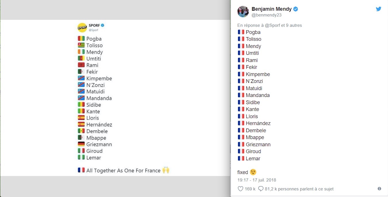 J’ai senti par le passé que certains joueurs de l’équipe de France avaient la même amertume et le même ressentiment9. Ainsi, Karim Benzema déclarait au début de sa carrière qu’il jouait pour la France pour sa carrière sportive, mais que son pays, c’était l’Algérie10. Alors qu’il n’y a jamais vécu. Le contraste est saisissant quand je vois les sourires et la fierté de porter le drapeau des joueurs de cette équipe de 2018. Je suis convaincu qu’ils se sentent tous français à part entière. D’ailleurs, en visite dans ma banlieue d’origine, combien de petits de toutes les couleurs arborent le maillot bleu blanc rouge aujourd’hui ! Les temps ont bien changé, et changé en bien. Benjamin Mendy, défenseur de l’équipe de France, a parfaitement résumé cet état d’esprit. Répondant à un tweet qui associait à chaque joueur un drapeau d’un de ses pays d’origine, il l’a réparé en associant à chaque joueur le drapeau de la France.