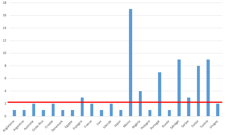 Nombre de joueurs nés à l’étranger par équipe. La ligne verticale rouge indique la moyenne (2,5). Les équipes sans joueurs nés à l’étranger (Allemagne, Arabie Saoudite, Belgique, Brésil, Colombie, Corée du Sud, Mexique, Panama, Pérou et Suède) ne sont pas représentées.