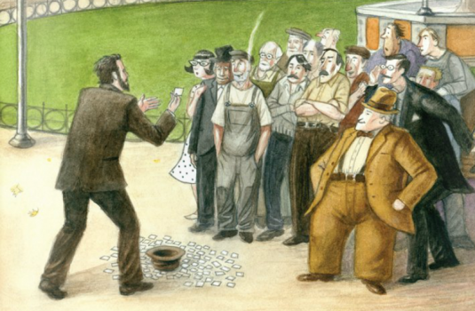– J’ai besoin de récolter des fonds pour réparer la fontaine, rénover les lampadaires et, tant qu’à faire, m’acheter une diligence, dit le maire. Je mets ainsi à la vente mille petits papiers officiels qui coûtent un cheval chacun. Lorsque la fontaine versera de l’eau, que les lampadaires scintilleront et que ma diligence m’emmènera loin, je donnerai deux chevaux en échange de chaque papier. Ils sont en vente dès maintenant. Vite, dépêchez-vous avant qu’ils ne s’épuisent !
