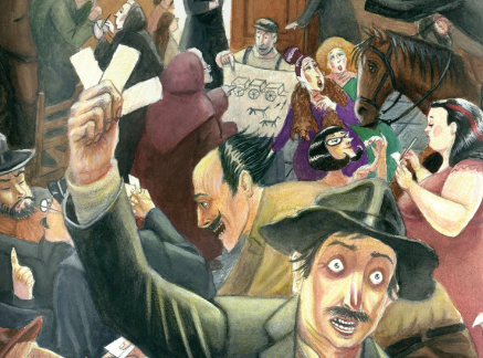 Rapidement, la place devint pleine à craquer : les villageois grimpaient sur les lampadaires ou montaient sur la fontaine pour acheter ou vendre des parts de nouveaux projets.