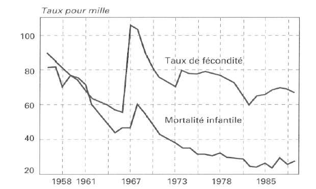 Le taux de mortalité infantile a également augmenté entre 1967 et 1968 passant de 46,6/1000 à 59,5/1000.30 À ce chiffre, il faut rajouter celui non connu des femmes mortes à la suite d’un avortement pratiqué illégalement. « Chaque gain de naissances a été obtenu en tuant des enfants. »31 Après ce pic de 1968, la mortalité infantile va baisser pour arriver en dessous de 40/1000 en 1973.32