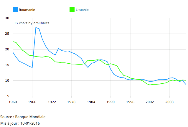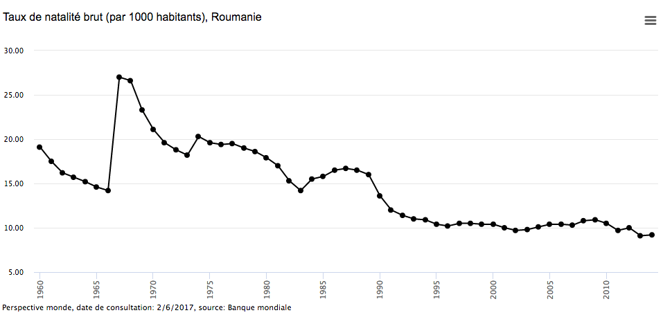 4) Taux de natalité brut (par 1’000 habitants), Roumanie, http://perspective.usherbrooke.ca/bilan/tend/ROM/fr/SP.DYN.CBRT.IN.html, [En ligne], consulté le 2 juin 2017.