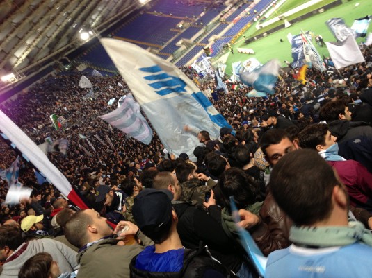 Désormais, les couleurs jaune et rouge sont remplacées par le bleu céleste des supporters de la Lazio. Chauffés à bloc par un de nos collègues genevois, supporter de la Lazio qui effectue là son premier déplacement à l’Olimpico, nous ressortons nos écharpes et nous dirigeons vers notre secteur. L’équipe de Jet d’Encre passe un premier contrôle de billets, s’en suit un immense tourniquet où un petit filou en profite pour se glisser à l’intérieur de l’enceinte en compagnie de l’un des membres du groupe. Un de nos amis, abonné de la Juventus, nous chuchote que c’est une pratique courante en Italie. Résultat, dans de nombreux matchs de Série A, les différentes tribunes accueillent souvent plus de monde que prévu, certains spectateurs prenant place parfois dans les escaliers. Dernière étape avant la libération, une fouille minutieuse nous est imposée par la police. Nous pénétrons finalement dans l’enceinte, excités comme des enfants devant leur cadeau de noël.