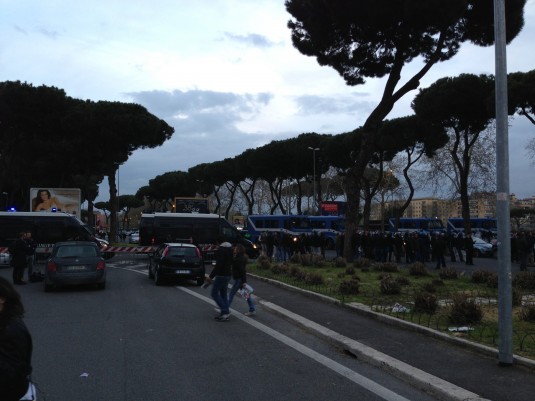 Quarante-cinq bonnes minutes de marche plus tard, nous nous retrouvons au pied de la Curva Sud. Il nous paraît opportun, dès lors, de cacher les deux-trois écharpes laziales achetées pour l’occasion afin de ne pas s’attirer la foudre de certains supporters de l’A.S. Roma. Devant le stade, la présence policière impressionne : des fourgons à perte de vue, la cavalerie nationale et même un hélicoptère, quadrillent le périmètre du stade. Les forces de l’ordre sont sur le qui-vive, et ils ont raison. En effet, devant l’enceinte nous assistons à un début d’échauffourée entre supporters des deux camps, rapidement maîtrisé par les carabinieri24. En se frayant, tant bien que mal, un passage à travers les différents barrages mis en place par la police, nous atteignons enfin l’entrée de la Curva Nord.