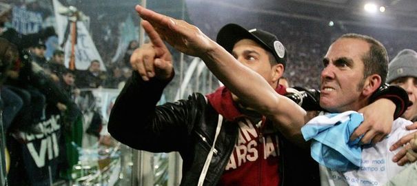 Il est d’usage d’affirmer que les ultras de la Lazio sont souvent assimilés politiquement à des nationalistes, flirtant avec l’extrême droite. On constate facilement cela les jours de match de l’un des deux clubs de la capitale. Nombreux sont les drapeaux italiens qui fleurissent la Curva Nord, et de manière plus occasionnelle, des bannières ornées de la croix celtique19 les accompagnent. Symbole de cette dérive extrémiste des supporters laziales : le fameux salut fasciste de Di Canio envers la Curva Nord, après une défaite contre Livourne, club connu pour ses supporters d’extrême gauche. Il aggrave son cas en récidivant quelques années plus tard dans le derby. Un geste qu’il qualifie de « salut romain, en direction de ceux qui partagent les mêmes opinions que lui ».