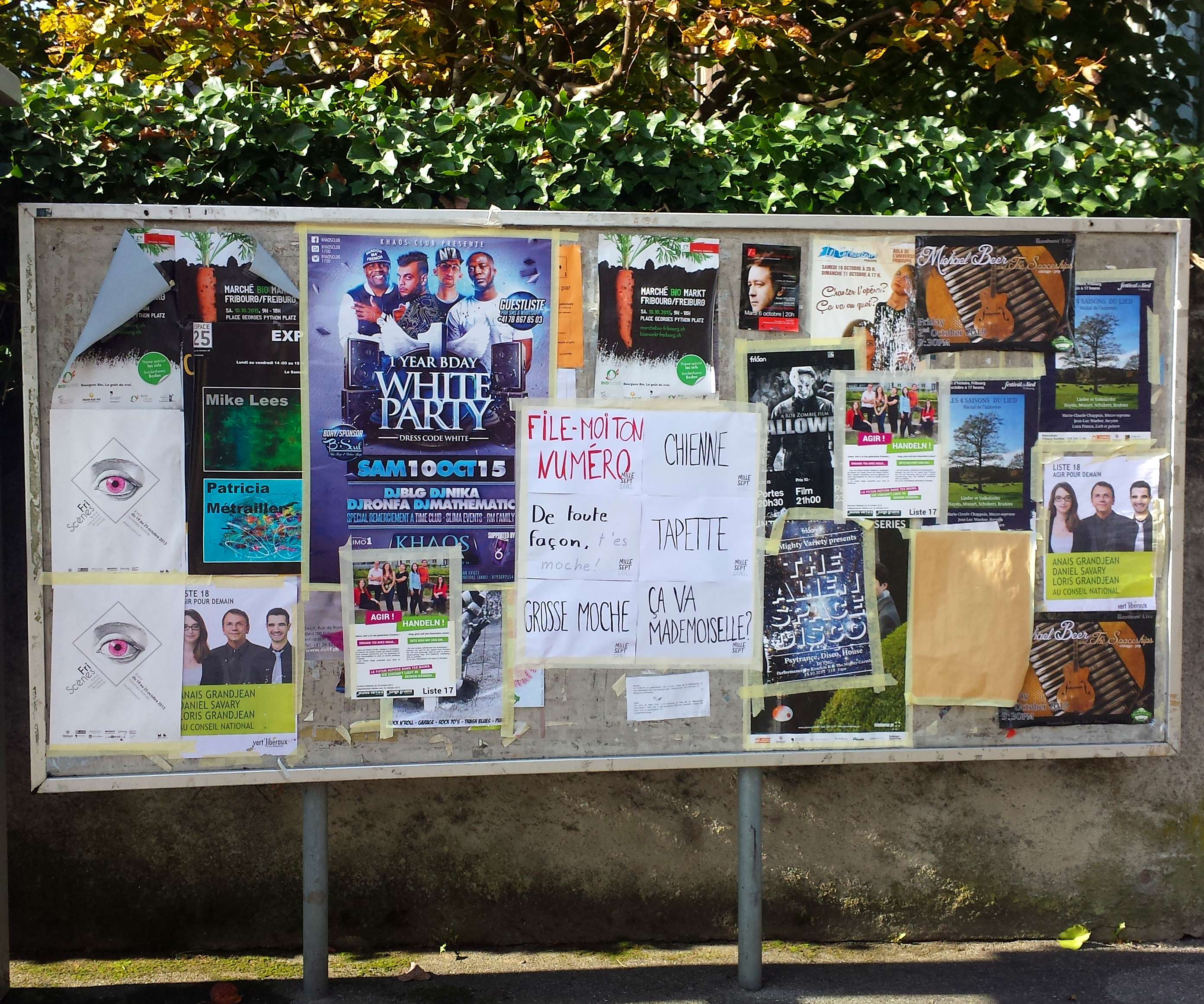 Le 8 octobre dernier, le site www.milleseptsans.ch a été lancé. Pour marquer le coup, nous avons placardé les panneaux d’affichage de la ville de remarques associées au harcèlement de rue (cf. photo). La démarche, volontairement « harceleuse », représente on ne peut mieux la problématique soulevée. Pour anecdote, une majorité des affiches a été arrachée (et non recouverte) dans les 24 heures. Comme quoi, on ne peut pas plaire à tout le monde.