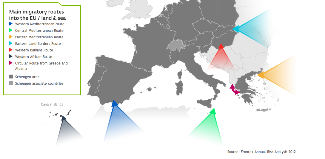 Les principales routes consistent à traverser le Maghreb par les enclaves espagnoles de Melilla et Ceuta, ou à se rendre directement sur la côte sud de l’Espagne; à traverser la Libye et la Tunisie, puis à atteindre la Sicile et atteindre l’Italie via Malte ou la petite île de Lampedusa; et à partir de la Turquie, à traverser le Dodécanèse pour gagner la Grèce ou la Sicile.