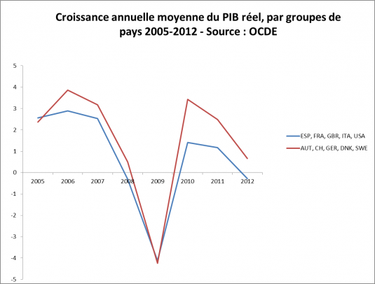 En ces périodes de crise aux multiples aspects (économique, écologique, morale, et de puissance souveraine), le besoin en réformes courageuses et progressistes est grand. Or, force est de constater que les États où deux partis se font traditionnellement « la guerre », comme la France ou les États-Unis, ont eu et ont toujours un mal terrible à faire évoluer leurs politiques nationales et internationales. Citons quelques autres pays dont l’histoire politique contemporaine4 est marquée par l’empreinte du bipartisme : l’Italie, l’Espagne, la Grèce – la Grande-Bretagne, à la limite. Tous vivent des périodes politiques turbulentes au regard de leur histoire contemporaine, comme encore démontré par les récentes élections italiennes. Une situation qui contraste avec les quelques autres États dont les gouvernements sont le plus souvent issus de coalitions : l’Allemagne, le Danemark, l’Autriche, la Suisse, la Suède… Ces nations s’imposent instinctivement plus comme des « modèles », et leurs forces progressistes semblent tirer l’Europe – et le monde ? – vers le haut. Ce sont également ces dernières qui, de loin, ont le mieux résisté à l’importante récession économique dont l’économie mondiale tente encore de se relever, comme le montre ce graphique.