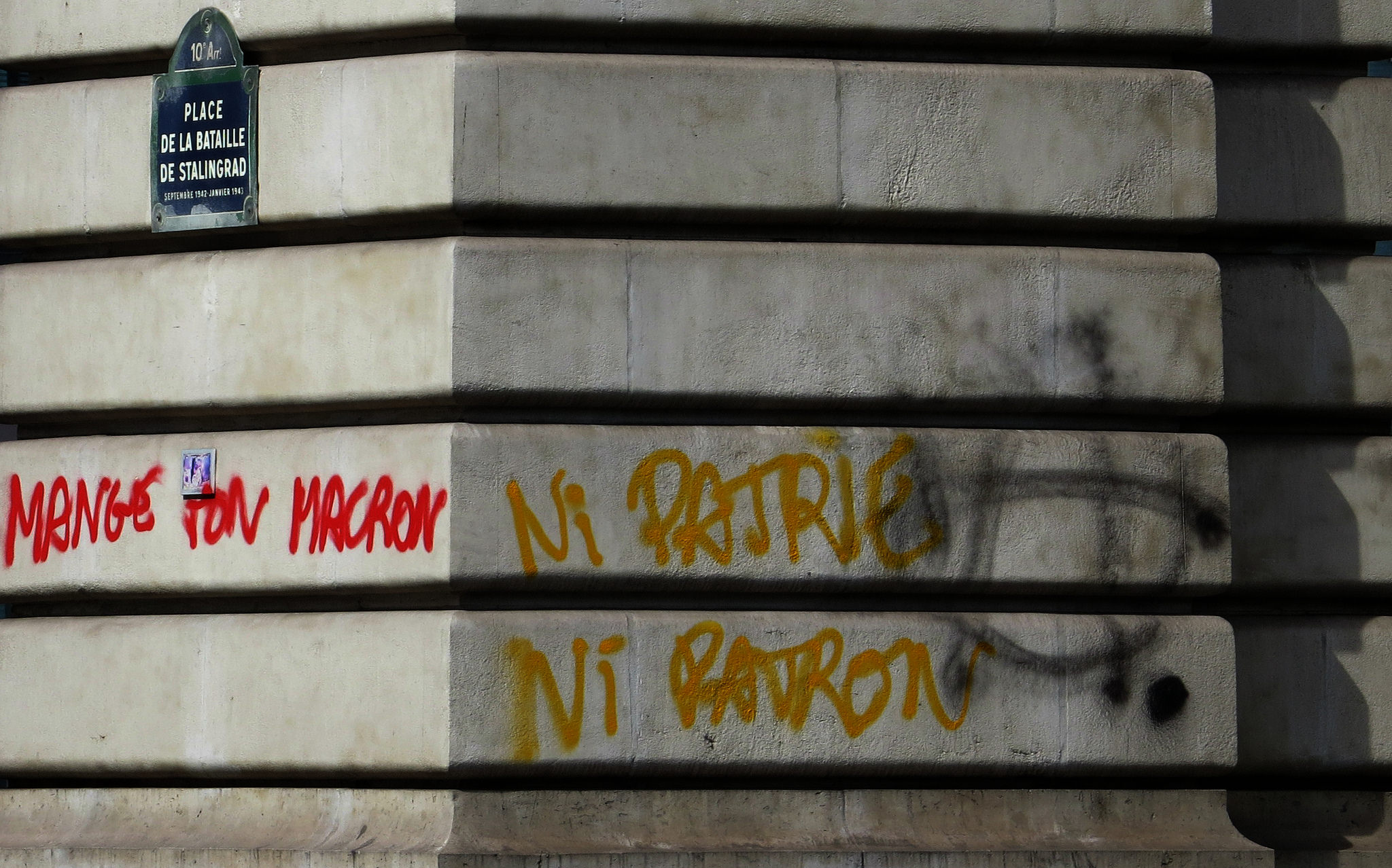 Un homme gribouille une photo d’Emmanuel Macron, Paris, le 21 avril © Radiowood