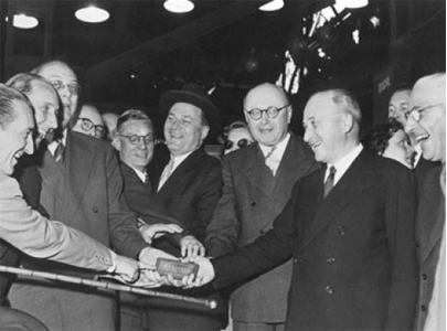 Jean Monnet tenant le premier lingot d’acier provenant des six pays encore en guerre 10 ans auparavant. © www.ceuropeens.org