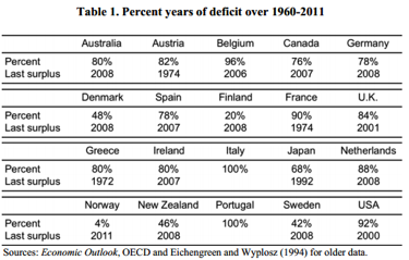 Les articles de cette série ont démontré que l’austérité infligée en pleine crise n’est pas une solution viable à court terme ; les dirigeants européens, et notamment ceux de la BCE, ont bien fini par s’en rendre compte, puisque le 6 septembre 2012, la BCE annonçait soutenir sans limites les pays endettés de la zone euro. Cependant, il convient de ne pas oublier que si les marchés financiers ont durement puni la zone euro dans son ensemble, c’est parce que les États de cette dernière se sont, il faut le dire, mal comportés. Le tableau3 ci-dessus montre le pourcentage d’années entre 1960 et 2011 où le budget effectif des pays en question s’est retrouvé négatif. Le constat est frappant : parmi les membres de la zone euro, seuls le Danemark et la Finlande sont parvenus à obtenir plus de surplus que de déficits. A l’opposé, l’Italie n’a tout simplement jamais eu un budget positif sur l’entière période, soit depuis 51 ans (34 ans pour le Portugal)!