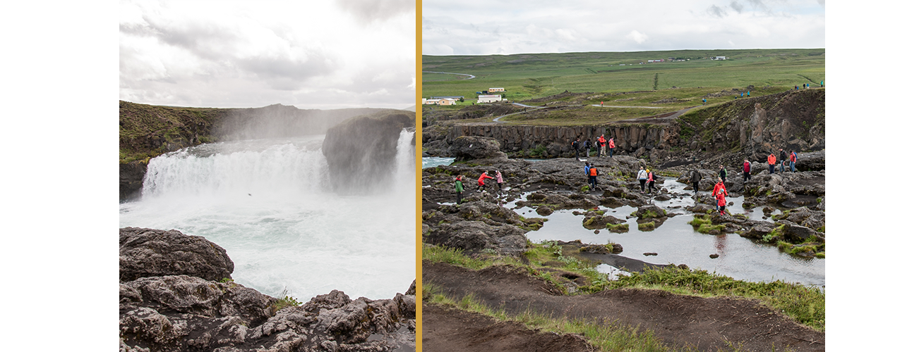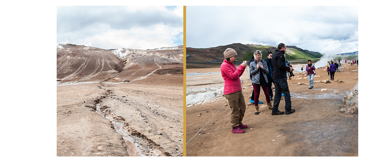 Ne vous laissez donc pas tromper par les splendides photos de nature sur lesquelles ne figurent pas d’humains et que des agences de voyage ou même vos amis publient sur les réseaux sociaux. Il est possible de trouver en Islande des lieux où vous ne croiserez pratiquement personne, notamment dans le centre de l’île ou dans les autres régions mieux préservées du tourisme, mais les grandes cascades, geysers, lacs glaciaires et autres lieux remarquables, en été du moins, sont pratiquement tous ciblés par les touristes. Voici une série de photos prises sur place au cours d’un voyage effectué à l’été 2017. A gauche, un cadrage soigneusement sélectionné afin d’éviter la présence d’humains sur la photo ; à droite, ce que l’on peut être amené à voir sous un autre angle. Ces photos ont été prises à chaque fois dans le même lieu, à 30 mètres près l’une de l’autre, au cours de la même demi-heure.
