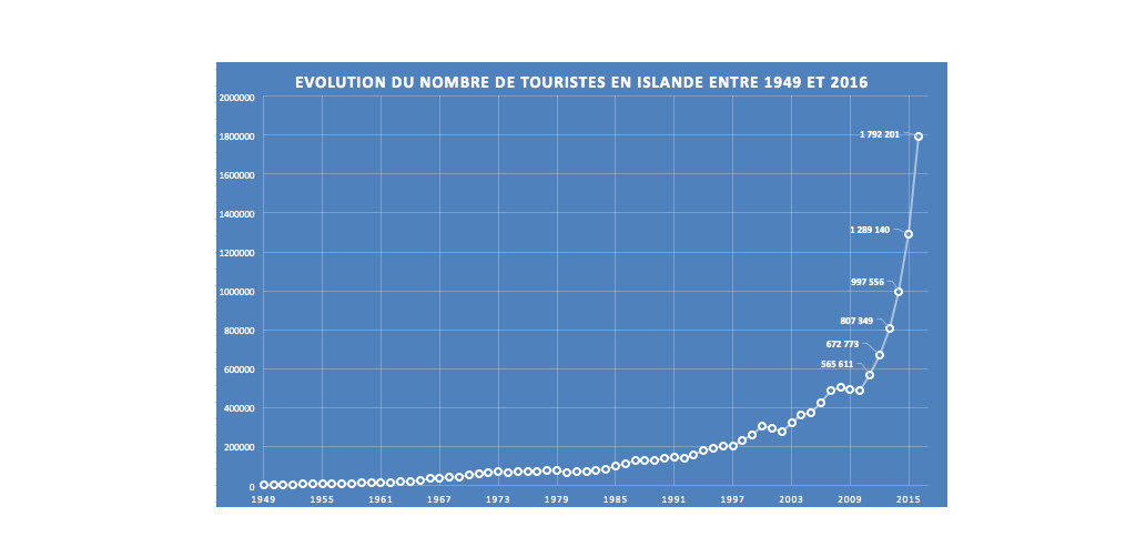 Selon des statistiques publiées par le « Iceland Tourist Board » (Ferðamálastofa)1, le nombre de touristes qui se rend à destination de Keflavik, principal aéroport de l’île, a explosé depuis 2010 et d’autant plus au cours de ces deux dernières années : 302’900 touristes sont venus sur l’île en 2000, 488’622 en 2010 et 1’792’201 en 2016. En 2016, vingt-cinq compagnies proposaient un vol pour l’Islande alors qu’elles n’étaient que onze à le faire en 20102. Ces touristes sont surtout des Etats-uniens, des Allemands et des Britanniques (l’ordre sur le podium dépend des saisons). Mais qu’est-ce qui a bien pu rendre l’Islande si populaire ?