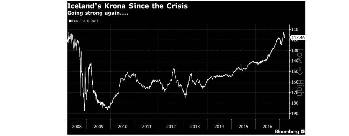 L’Islande est particulièrement touchée par le tourisme, mais il faut souligner aussi que cette frénésie touristique s’inscrit dans des mouvements plus larges. Le nombre de touristes non européens qui se rendent en Europe a augmenté au cours de ces dernières années7, phénomène qui n’a pas épargné l’Islande dont le tourisme en provenance de Chine est de loin la progression la plus importante parmi les nationalités représentées entre 2014 et 20168. Les voyages en avion sont de moins en moins chers ; l’information est de plus en plus facilement diffusable, diffusée et accessible grâce au numérique ; et la couronne islandaise, devise forte avant la crise de 2008, a considérablement baissé entre 2008 et 2015, rendant le pays plus abordable (la devise recouvre ses forces d’antan, nous en parlerons en fin d’article).