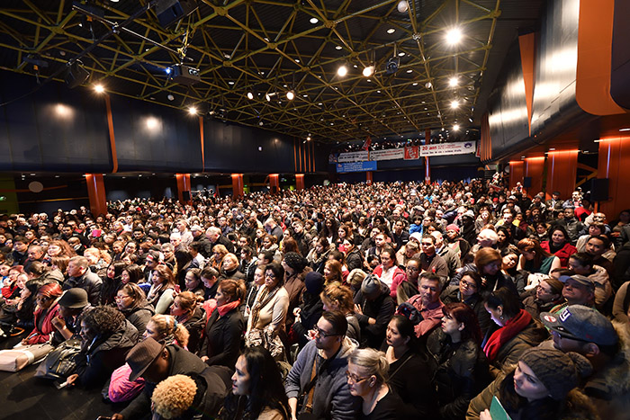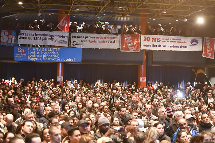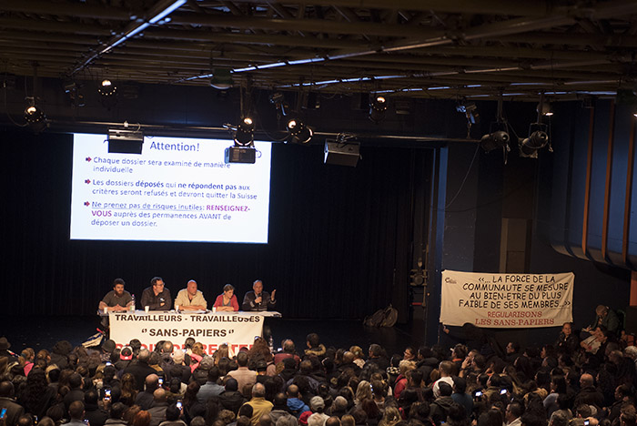 Photo prise lors de la première soirée d’information pour les « sans-papiers » tenue à propos de l’opération Papyrus, le 28 février 2017 (soit une semaine après l’annonce publique du projet), au Palladium à Genève.