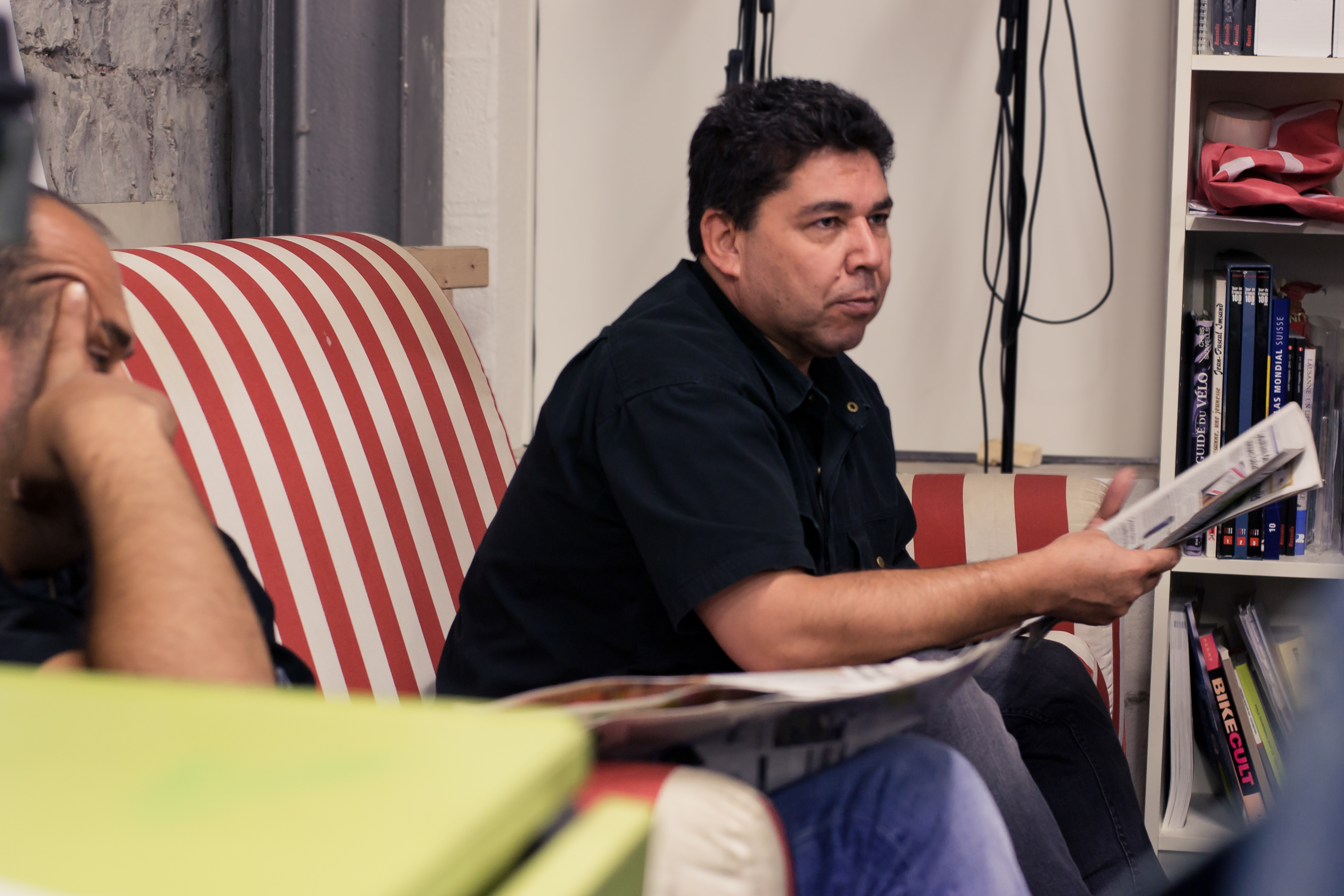 Après la réception, on arrive à l’unique salle que comporte l’endroit, avec quelques vélos entreposés, des outils accrochés sur des supports aux murs, ou posés sur les étagères. Une odeur de petit garage. À gauche, un canapé rayé blanc et rouge, deux petites tables et des chaises, ainsi qu’un petit comptoir avec la machine à café. C’est ici que les intéressés se retrouvent devant une boisson chaude pour la lecture quotidienne du journal. Huit heures tapantes : déjà tous présents. Je suis l’un des derniers à arriver. Sam, blond aux cheveux bouclés et touffus, se présente à moi comme civiliste. C’est lui qui anime la lecture et à tour de rôle, chacun choisit et lit un article plus ou moins long, selon son niveau, souvent avec difficulté. Le civiliste les aide à prononcer juste, puis discussions autour du sujet en question : une nouvelle application pour smartphone, un bilan des « sexbox » genevoises, le record mondial du plus haut plongeon.