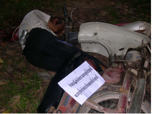 « Si vous continuez à arrêter des Malaisiens [de Patani] innocents, nous continuerons à tuer des bouddhistes thaïlandais innocents » : un message menaçant déposé aux côtés d’un homme décapité et transmis par un groupe insurgé indéterminé. Photographe anonyme.