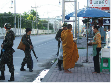 L’armée est massivement stationnée dans ces provinces, avec plus de 50,000 soldats déployés sur le terrain. Le sergent Kathawut Thalom, en poste dans la province de Yala depuis avril 2011, m’a expliqué que l’objectif de sa mission était de protéger les civils de la région du sud et de leur expliquer la présence de l’armée. C’est un fait : des soldats lourdement armés protègent maintenant les écoles, les moines et les espaces publics. Les Malais musulmans sont évidemment inclus dans cette opération, comme le déclare le sergent Kathawut : « nous rendons toujours justice aux musulmans car il est de notre devoir de les protéger ».