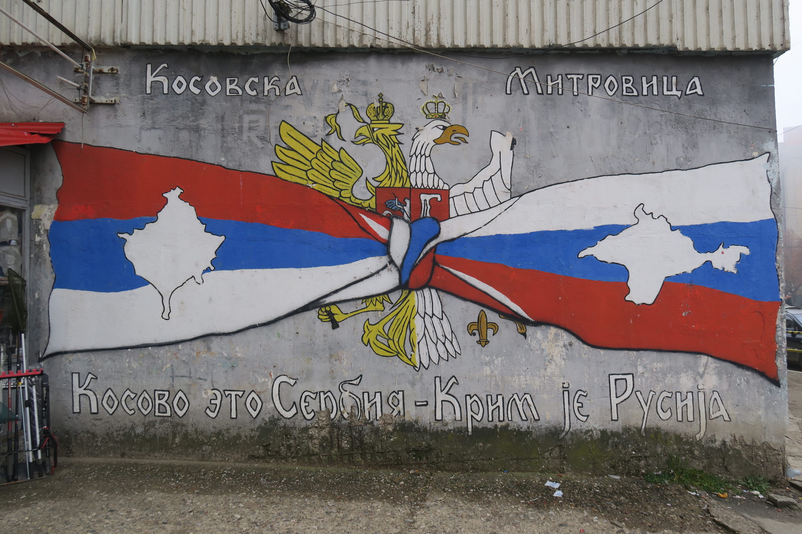 En parcourant à pied les rues de Mitrovica, il est clair qu’il n’y a pas une ville, mais deux. Deux casernes de pompiers, deux mairies, deux systèmes de distribution d’électricité, deux compagnies de transports publics et des écoles pour chaque communauté. De part et d’autre des rives de l’Ibar, les symboles nationalistes sont partout, bien visibles. Drapeaux albanais au sud, drapeaux russes et serbes au nord. Quant aux drapeaux du Kosovo, ils se font timides. Des statues d’hommes ayant marqué l’histoire des deux peuples trônent dans chacun des centres-villes. Du côté serbe, plusieurs graffitis nationalistes ornent les murs. On peut y lire : « Cela vaut la peine de se sacrifier pour cette terre », « On ne recule pas d’ici », ou encore « Le Kosovo à la Serbie comme la Crimée à la Russie ».