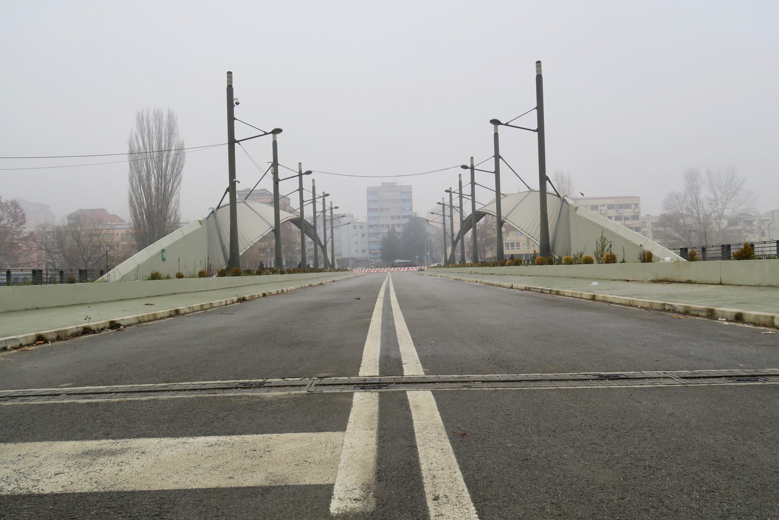 Le pont principal de Mitrovica. Depuis la fin de la guerre, il est gardé par les militaires de la KFOR. Symbole des tensions, il est fermé à la circulation. [V.Geneux]