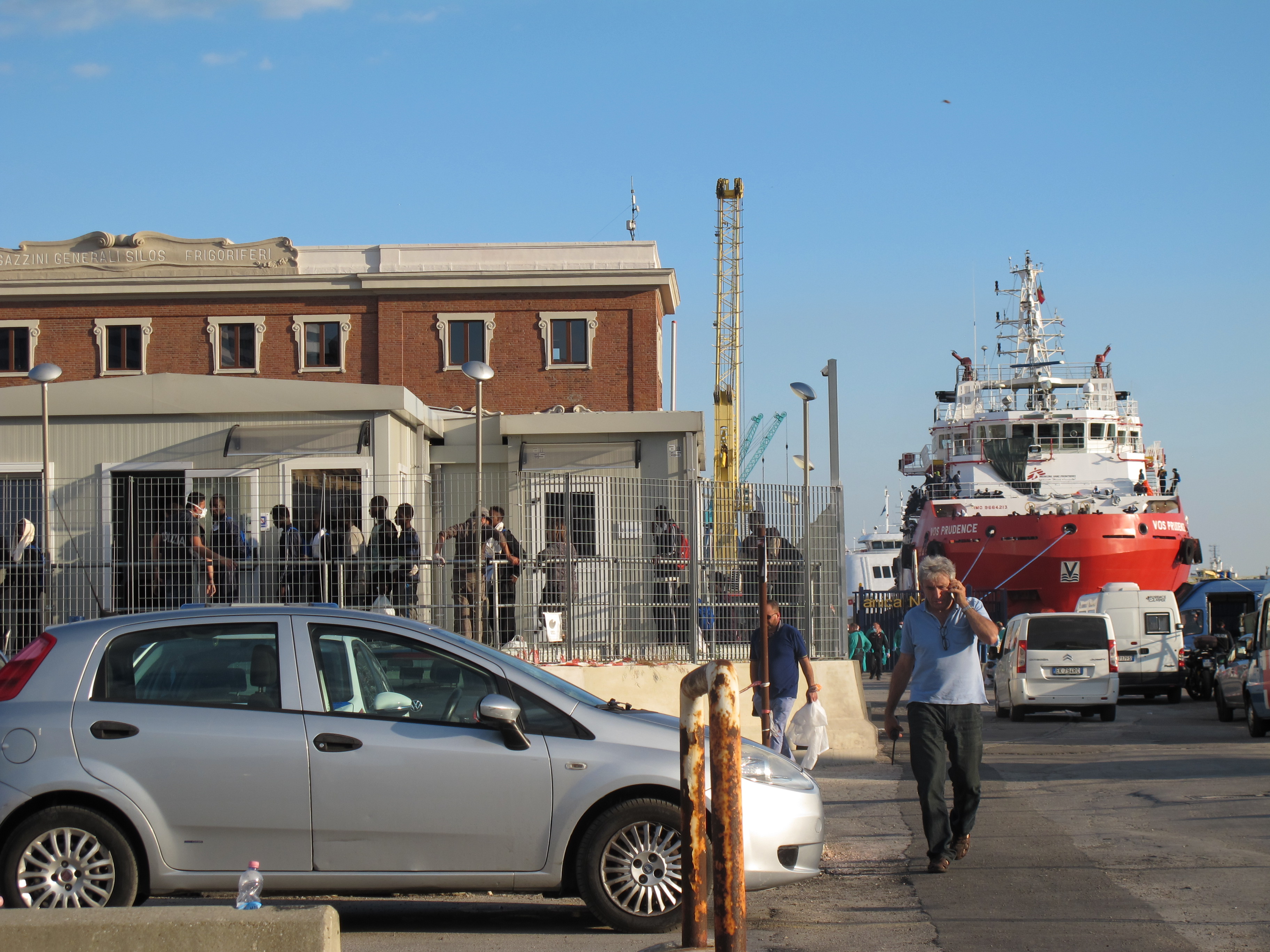 « Retrouvez-moi sur le port, embarcadère 29 » : après deux jours à arpenter les ruelles, observant le linge qui sèche sur les étendages de chaque fenêtre ou encore le salon d’une famille qui donne sur le trottoir, nous retrouvons Raniero en fin d’après-midi. Les yeux cernés, il est tout juste rentré avec d’autres militants d’une manifestation contre une rencontre du G7 en Sicile. Un spectacle inattendu s’offre à nous : un navire de Médecins Sans Frontières (MSF), surpeuplé, déverse lentement un flot de mille-cinq-cents personnes naufragées en Méditerranée. Troublés devant une scène dont la signification réelle nous dépasse, nous observons un moment le débarquement qui se fait sous haute surveillance policière.