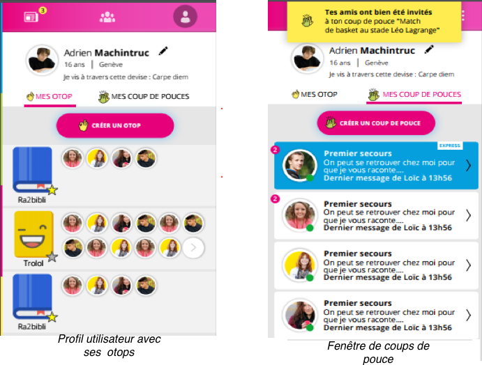 Lors de ces ateliers, il est apparu très clairement que les jeunes sont sensibilisés à un certain nombre de problématiques auxquelles fait face notre société. Ils ont un désir de s’engager, mais ne savent pas toujours par où commencer. Parfois ils ne se sentent pas légitimes ou compétents. En revanche, les ateliers ont démontré qu’ils accordent une grande importance au bien-être de leurs ami-e-s ; qu’ils les tiennent en haute estime et leur viennent en aide lorsqu’ils le peuvent. La considération de ses pairs est d’ailleurs primordiale pour se définir. Si les adolescent-e-s ont souvent des difficultés pour identifier leurs qualités et compétences, il suffit de leur demander celles de leurs ami-e-s pour crouler sous les superlatifs. Le concept de l’application OTOP était né : permettre aux jeunes de valoriser leurs compétences et celles de leurs ami-e-s pour mieux s’entraider. Pour cela, l’application intègre deux fonctionnalités principales, les « otop » et les « coups de pouce ».