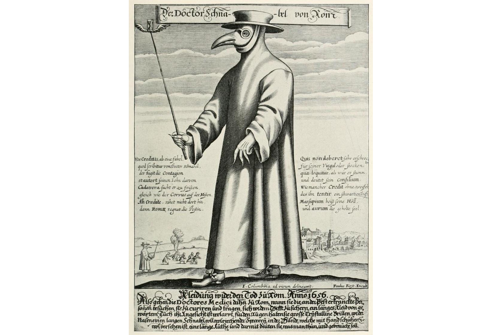 Gravure de Paul Fürst (1656) représentant un médecin durant une épidémie de peste à Rome au 17e siècle – « Doctor Schnabel » signifie « Docteur bec » –, dans : Eugen Holländer, Die Karikatur und Satire in der Medizin : Medico-Kunsthistorische Studie von Professor Dr. Eugen Holländer, Stuttgart, Ferdinand Enke, 1921, fig. 79, p. 171.