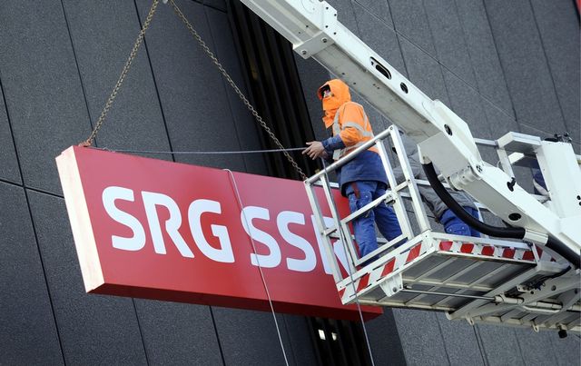 Installation du nouveau logo de la SSR sur le bâtiment de la télévision alémanique le 2 mars 2011 © Keystone.