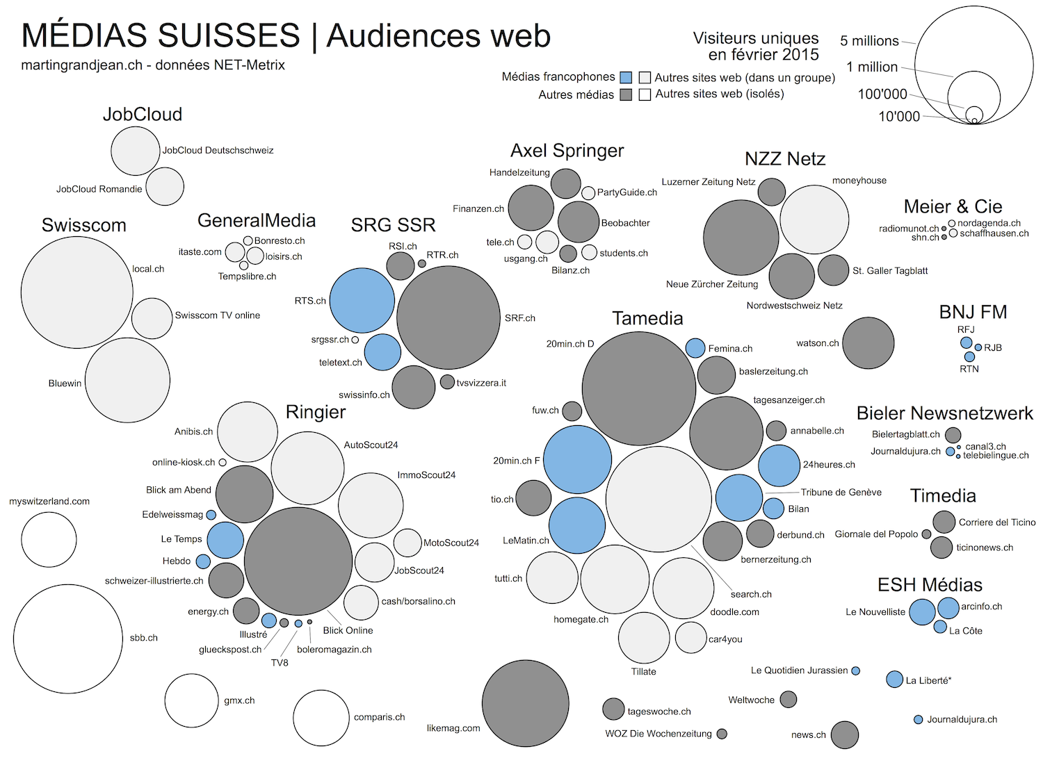 Note à propos des données : ces chiffres proviennent des rapports NET-Metrix et concernent le mois de février 2015. Tous les sites recensés par cette source ne sont pas visualisés ci-dessus, seuls les sites de médias sont affichés, auquel on ajoute à titre de comparaison une sélection de sites divers dont l’audience est la plus forte. On notera également qu’il est possible que quelques médias ne soient pas partenaires de NET-Metrix et qu’ils n’apparaissent donc pas. Il ne s’agit donc pas d’un panorama de tout le web suisse, mais des principaux domaines. (*) Les données de La Liberté sont prises sur un mois antérieur puisqu’elles ne sont plus disponibles cette année. On notera également que le résultat d’un comptage des “visiteurs uniques” et “pages vues” dépend beaucoup de l’outil et de la méthodologie : ces valeurs permettent donc de comparer les médias entre eux, inutile de les rapporter à des comptages Google Analytics ou autres.